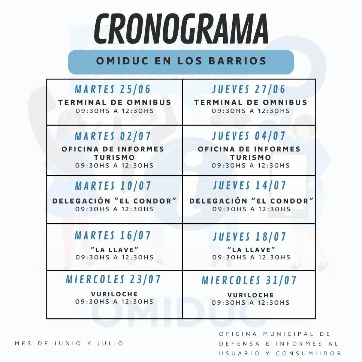 A partir de la semana del 24 de junio, OMIDUC atenderá los martes y jueves de 9:30 a 12.30 horas en distintos lugares de la ciudad, llevando el municipio donde la gente lo necesita. Se aconseja ir con la documentación/papeles necesarios para poder avanzar en las denuncias y reclamos.
