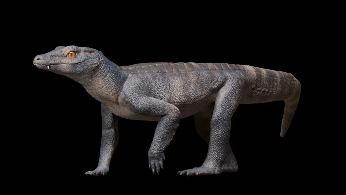 Se trata del “Araripesuchus manzanensis” encontrado en el Área Paleontológica de La Buitrera. De no más de un metro de largo y 40 cm de alto, tenía un hocico angosto con las fosas nasales al frente, ubicadas del mismo modo que las de un perro o un zorro.