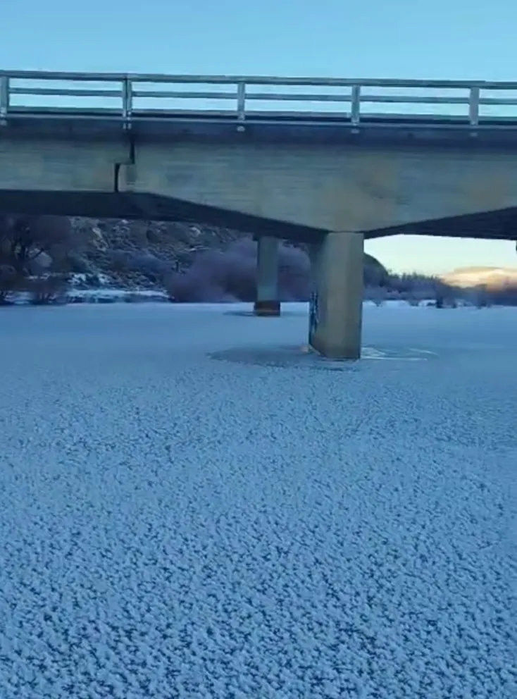 Los pobladores rurales que viven en la zona del río Pichileufu están acostumbrados a la postal, aunque esta vez el panorama es aún más contundente. El curso de agua se congeló debido a las bajas temperaturas que se registraron en los últimos días.