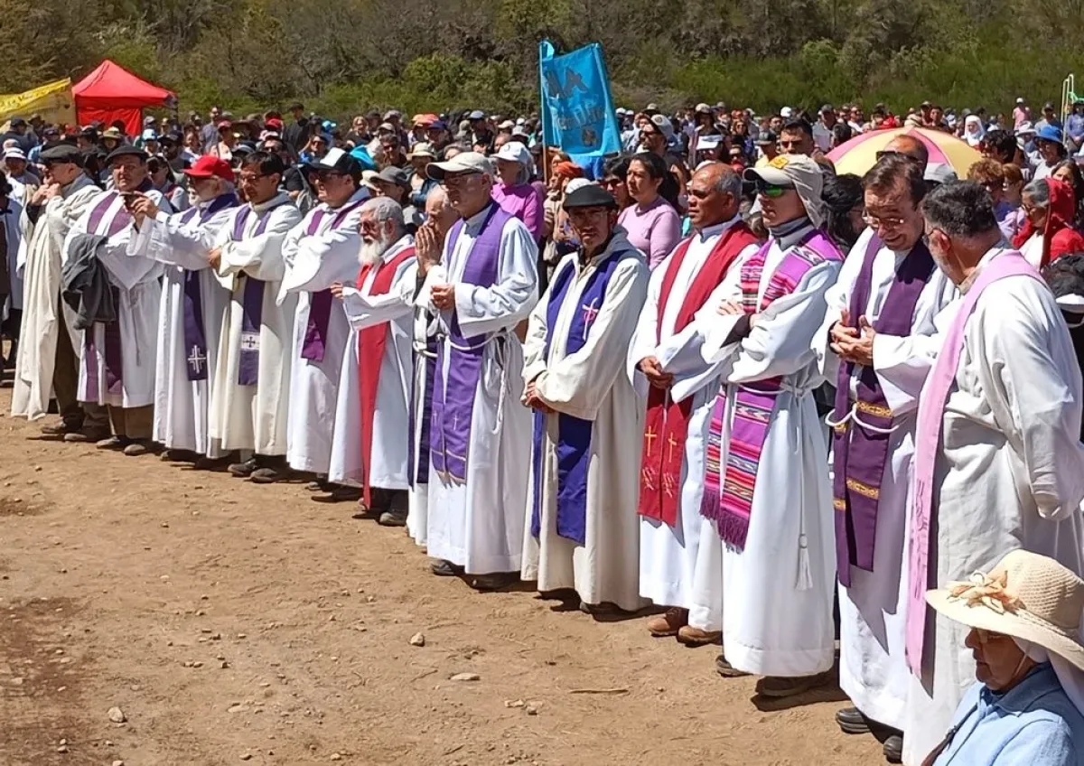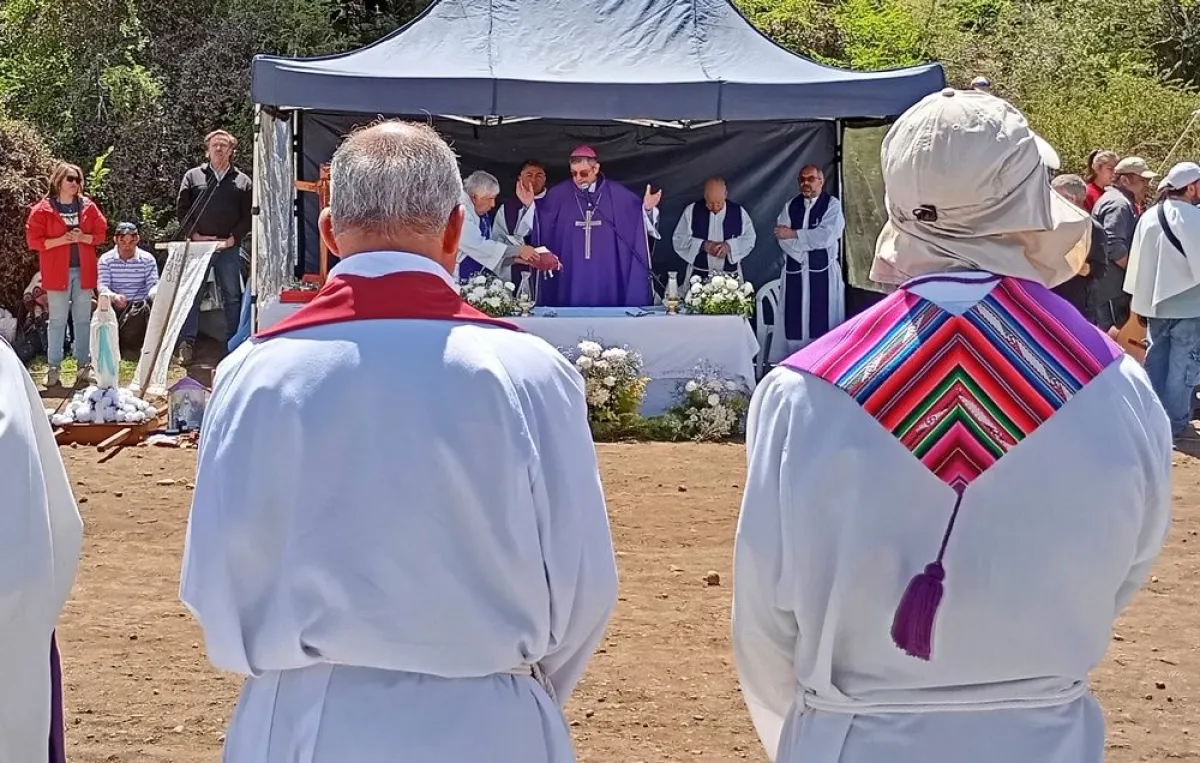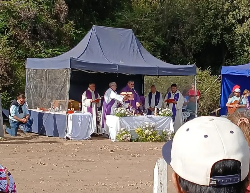 El obispo Juan Carlos Ares junto a cuatro sacerdotes ofició la primera misa ante los miles de peregrinos que se reunieron en el lugar, frente a los otros curas de la diócesis, que asistieron desde una hilera frente al altar, y al promediar la liturgia se unieron a los demás para administrar la comunión.