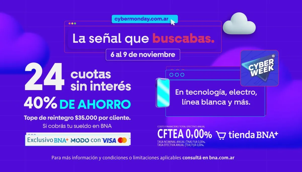 El Banco Nación extiende sus beneficios y descuentos al Cyber Week, ofreciendo la posibilidad de aprovechar las promociones del Cyber Monday para que más clientes puedan acceder a las mejores oportunidades de compra online y facilitar una planificación más tranquila y conveniente.
