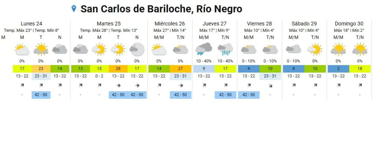 El Servicio Meteorológico Nacional anticipa para la última semana de noviembre en Bariloche un clima templado a cálido, con máximas que rondarán los 28 grados mañana martes 25.
