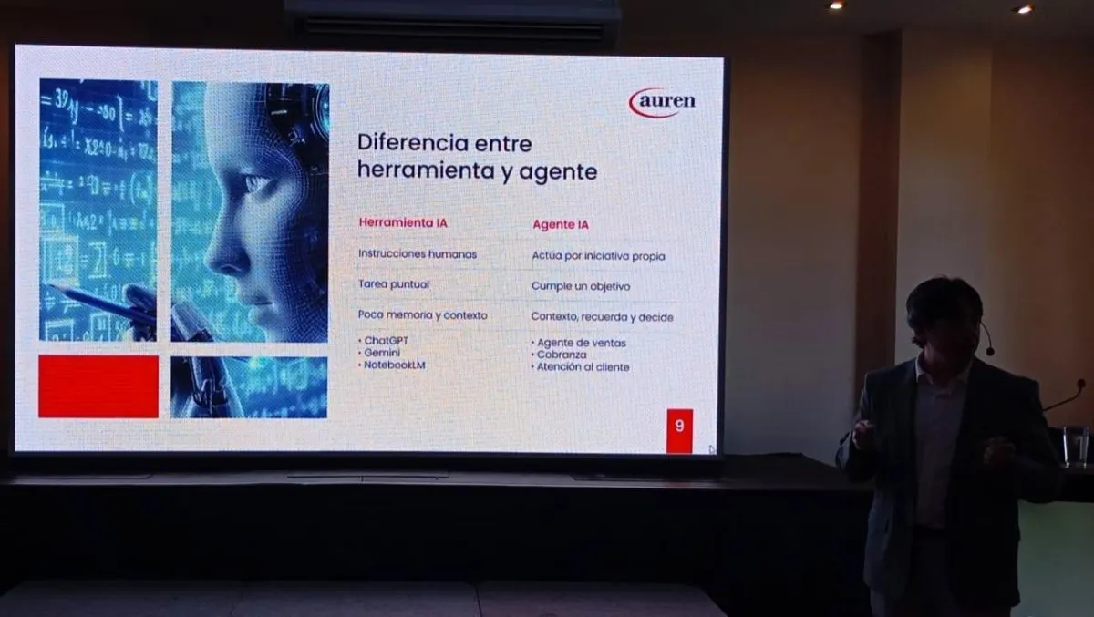 Instó a diferenciar entre una herramienta de IA y un agente IA. La herramienta recibe instrucciones para una tarea puntual, demanda poca memoria y trabaja con un contexto limitado: ChatGPT, Gemini, NotebookkLM.