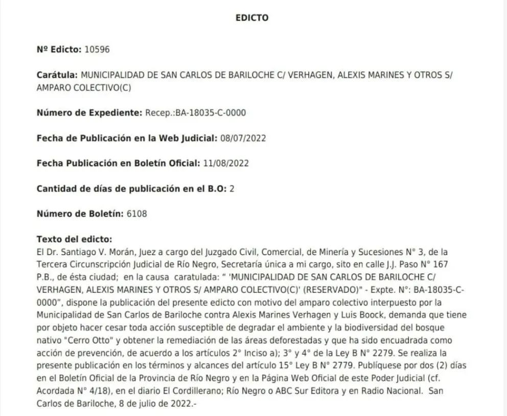 También un amparo colectivo por daño ambiental, contra Alexis Marines Verhagen y Luis Boock, llegó al despacho del juez Santiago Morán, quien en un fallo de no innovar dispuso cesar toda acción de desmonte de bosque nativo, y ordenó la remediación de las áreas afectadas. Nada cambió.