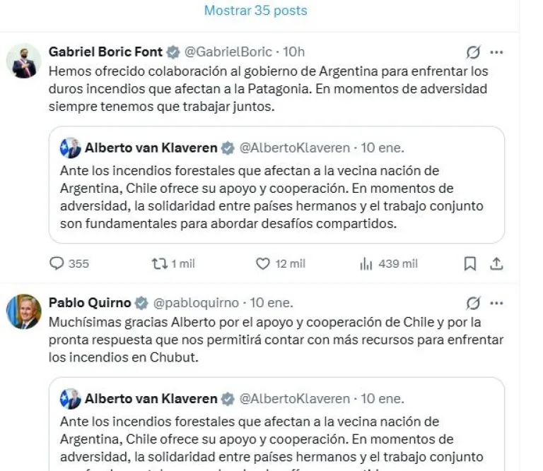 El canciller argentino Pablo Quirno le respondió por la misma red social: “Muchísimas gracias Alberto por el apoyo y cooperación de Chile, y por la pronta respuesta que nos permitirá contar con más recursos para enfrentar los incendios en Chubut”.