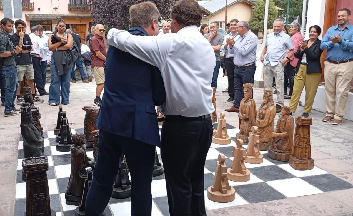 Estaban expuestas en el patio de la Casa del Bicentenario de Argentina de 2015, sobre unas baldosas blancas y negras que forman un tablero perfecto. El intendente Bruno Pogliano y el gobernador Alberto Weretilneck encabezaban un contingente de autoridades y vecinos para visitar la muestra histórica del Centenario, y al toparse con las piezas dispuestas para el juego, se trenzaron en una partida que comenzó amigable y enseguida ganó hostilidad.