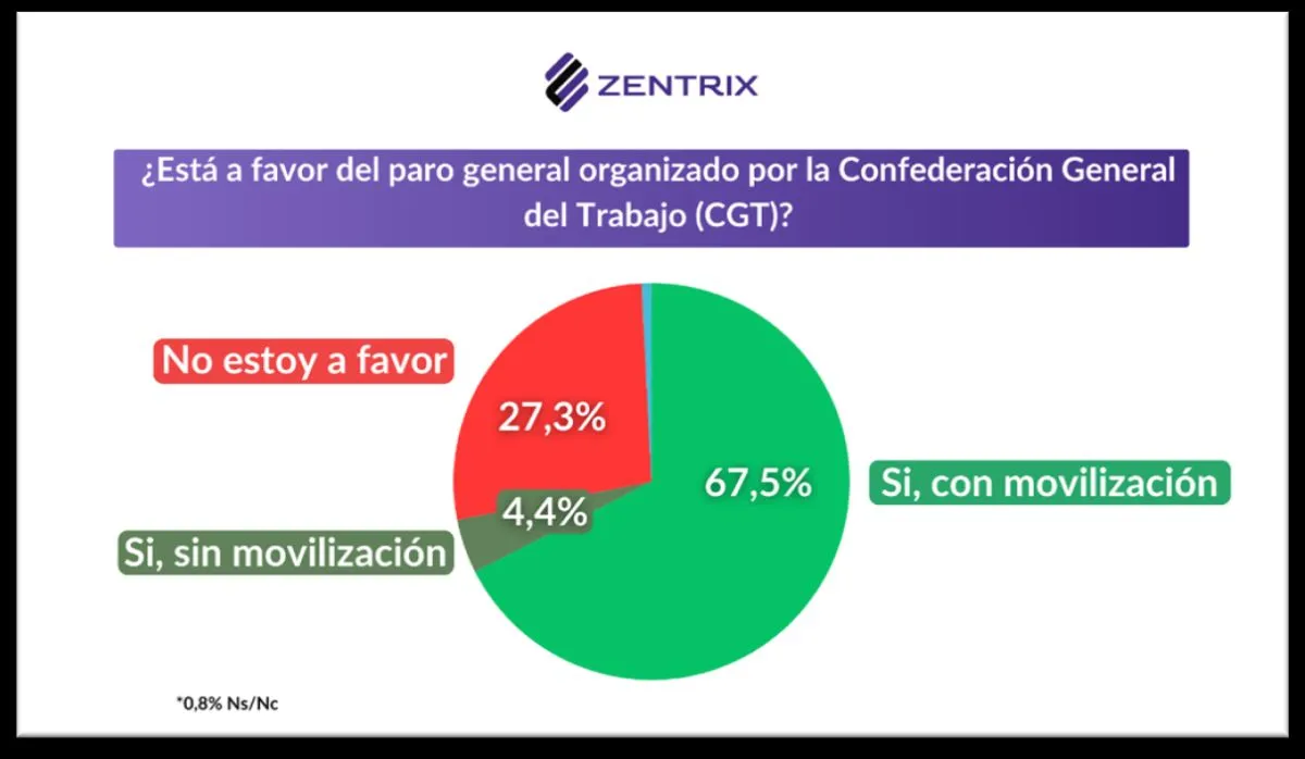 Un relevamiento nacional realizado por la consultora de opinión Zentrix durante las últimas 24 horas muestra que el 71,9% de los consultados está a favor del paro general convocado por la Confederación General del Trabajo (CGT). Advierten que el resultado se produce en un contexto donde el respaldo a la reforma laboral impulsada por el Gobierno Nacional cayó casi siete puntos en los últimos tres meses.
