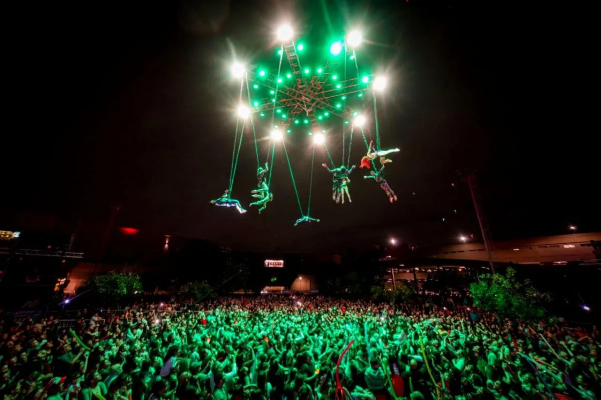 Este año el show aéreo será el plato fuerte. Es una puesta de gran escala que combina acrobacia, teatro, música y tecnología en una experiencia inmersiva pensada para públicos masivos. El espectáculo alcanza más de 50 metros de altura, impulsado por una grúa hidráulica, y presenta impactantes coreografías en estructuras especialmente diseñadas.