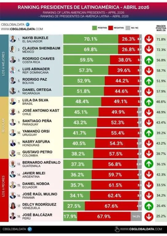 El ranking de abril lo lideran el presidente Nayib Bukele de El Salvador y Claudia Sheinbaum de México, mientras que Milei quedó en el puesto número 14. Un dato para analizar considerando que supo estar entre los primeros puestos, en los meses anteriores. Fue el segundo mandatario con la mayor caída de imagen, entre marzo y abril, y respecto de sus pares en Latinoamérica.